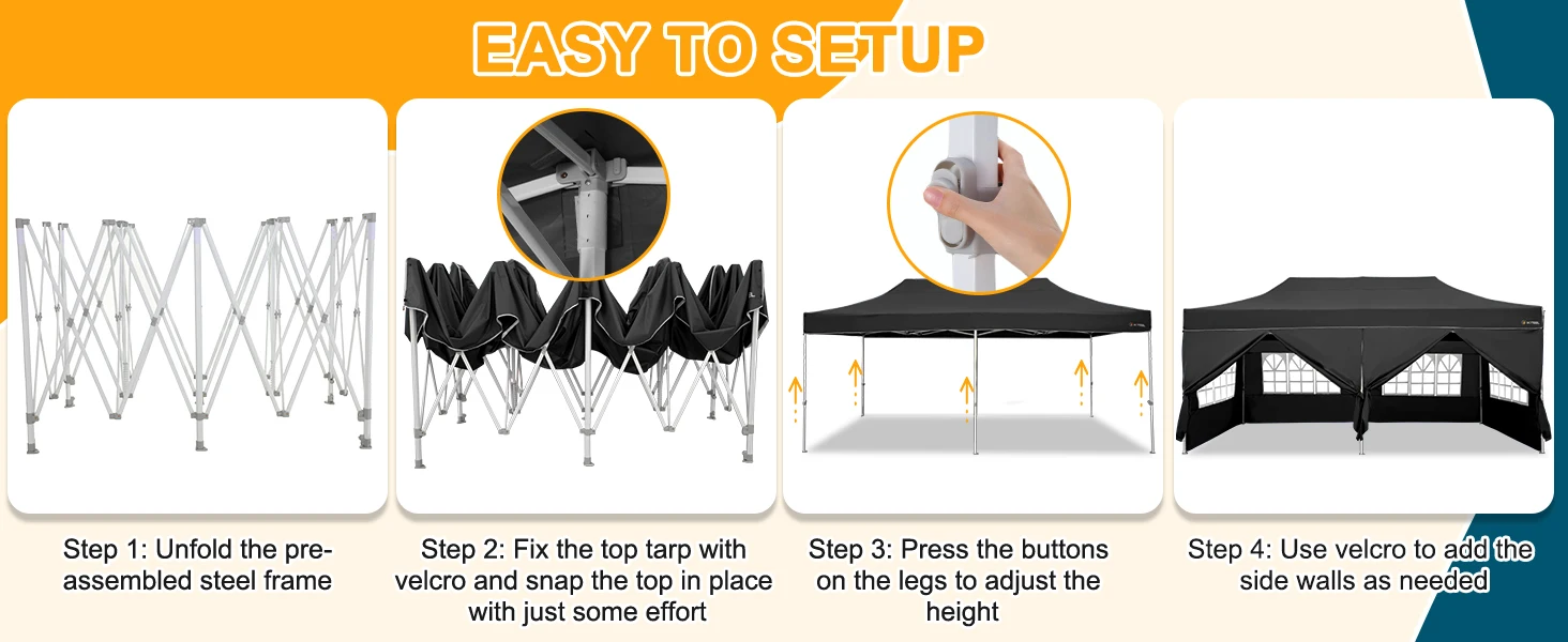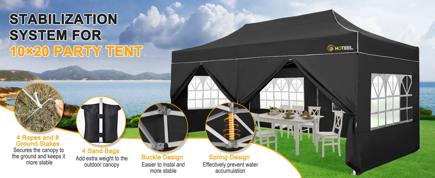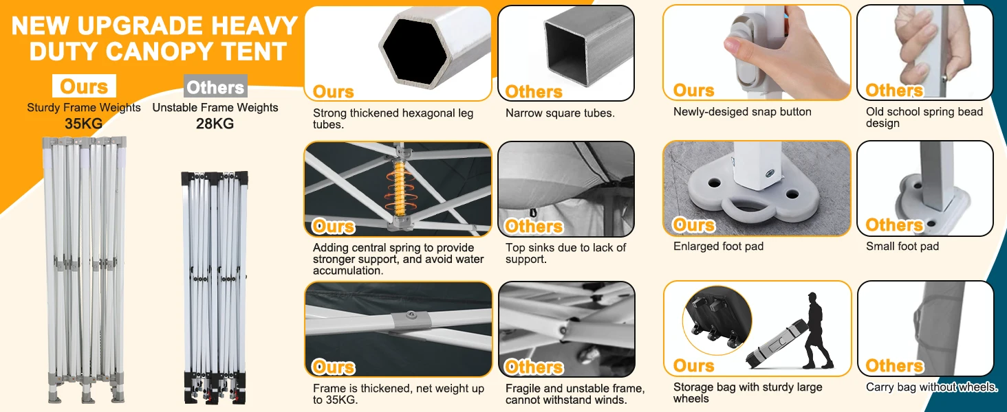 Upgraded Frame 10 x 20 pop up canopy tent heavy duty is made of commercial-grade stainless steel frame, thickened 1.6'' diameter hexagonal legs makes the canopy more stable and durable.