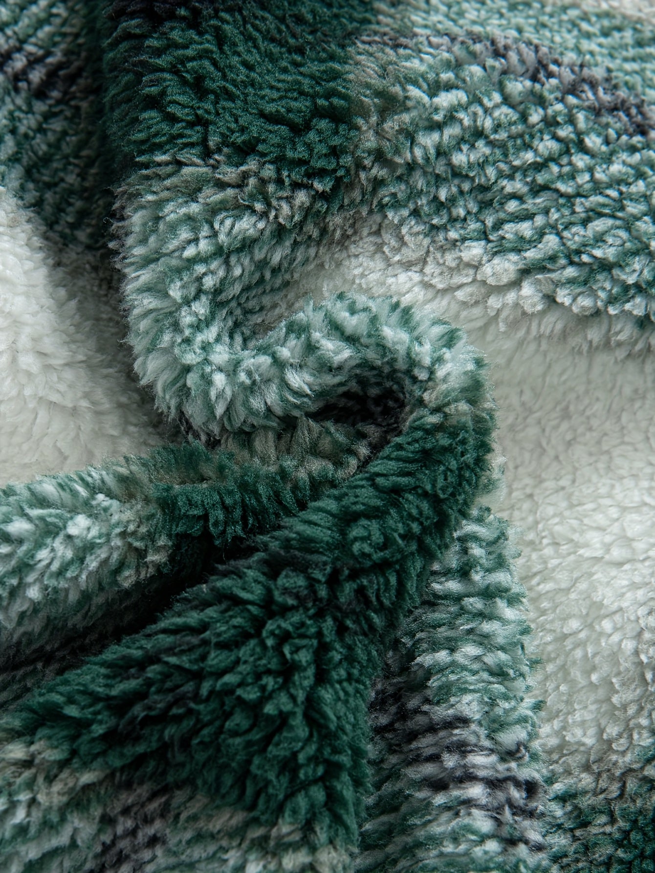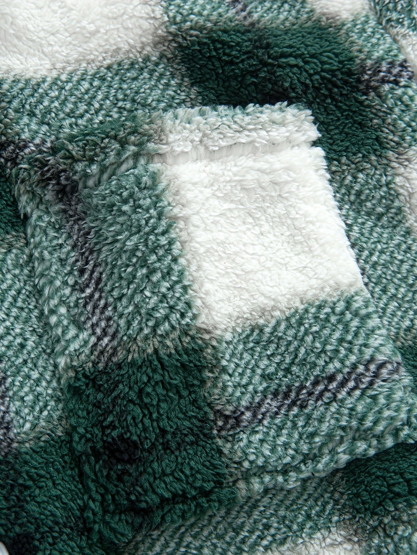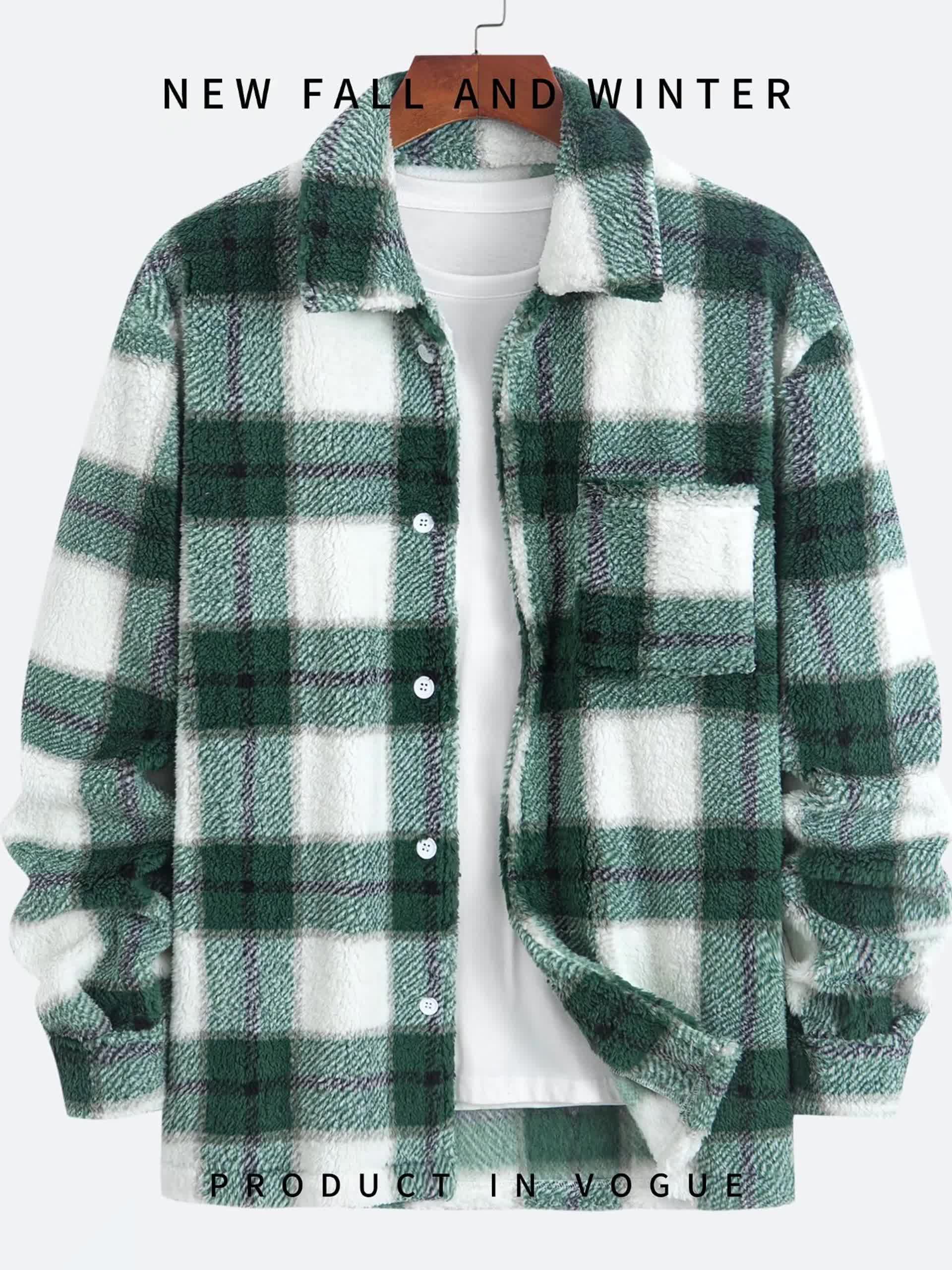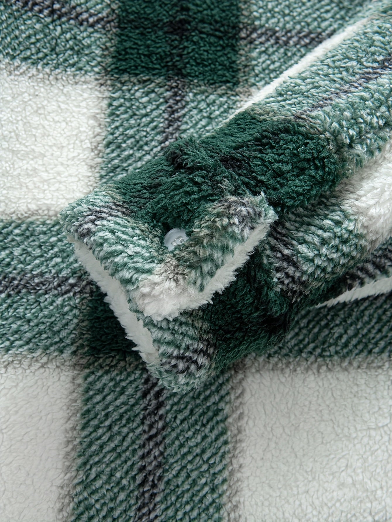 1pc Men's Plush Fleece Jacket with Green/White/Black Plaid Pattern - Double-Sided Collar & Lapel, Button-Front Closure, Regular Fit Long Sleeve Coat for Autumn/Winter, Casual & Semi-Formal Wear (Hand Washable)
