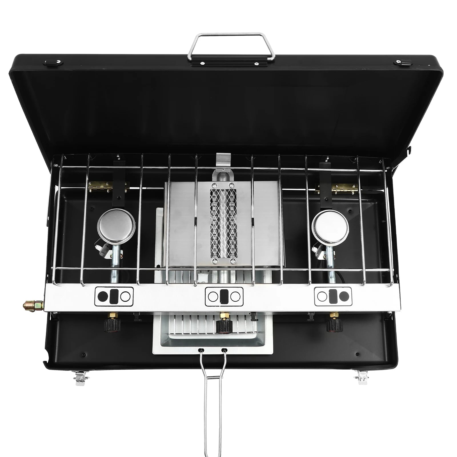 A portable and powerful grill will be an essential piece of equipment for outdoor camping cookouts. This foldable 3-burner camping stove is made of high-quality materials, featuring a lightweight body and great durability, which will be a quality choice for you. With a removable grid, a tray, and three built-in independent fire control burners, it is powerful enough to cook and grill with ease, allowing you to enjoy the pleasure of both camping and cooking.