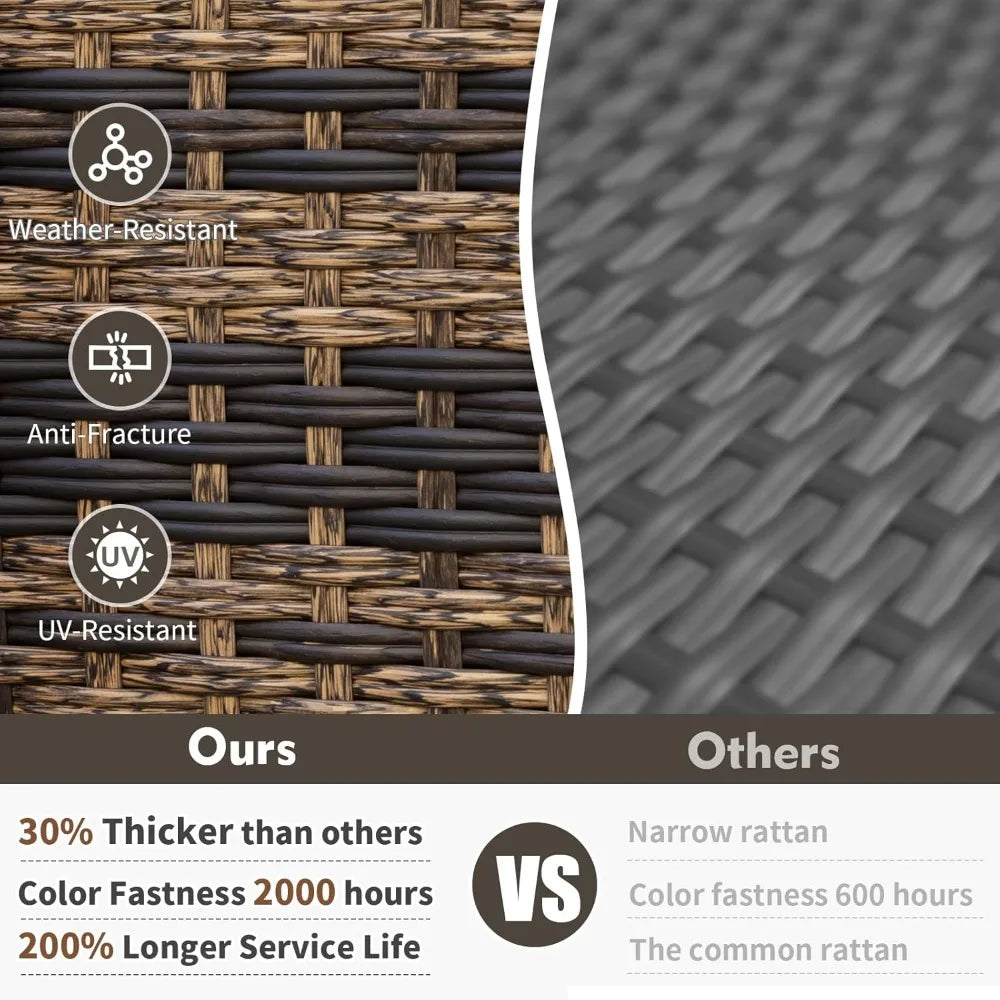 - All-Weather Durability: Build with a powder-coated steel frame and hand-woven PE rattan, this outdoor patio furniture set resists rain, sun, and rust, staying vibrant year after year for outdoor living you can rely on.