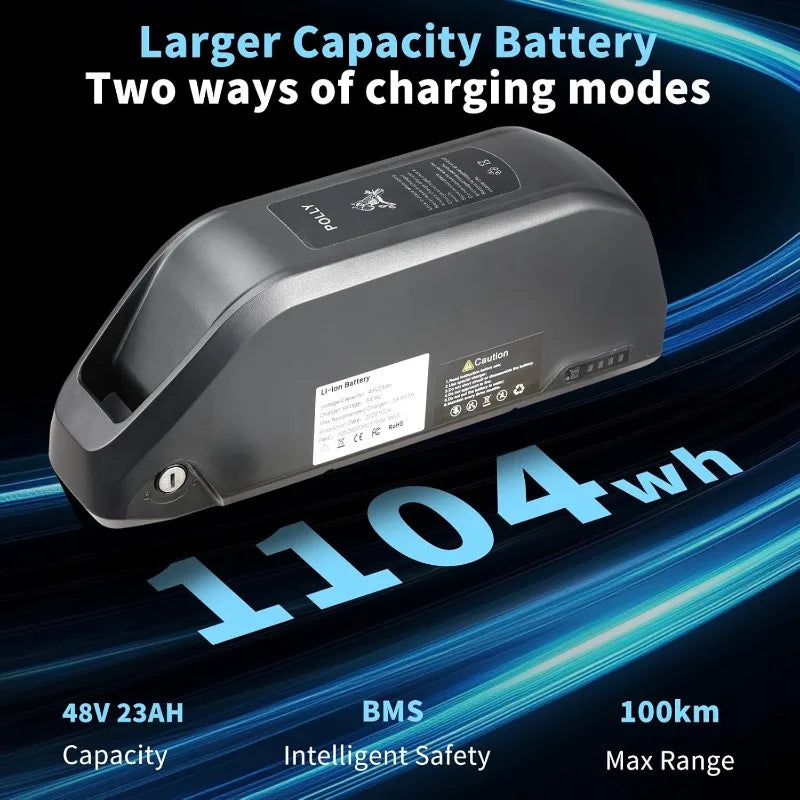 - Removable 48V 23Ah battery provides long-range capability and easy charging when you’re out exploring.