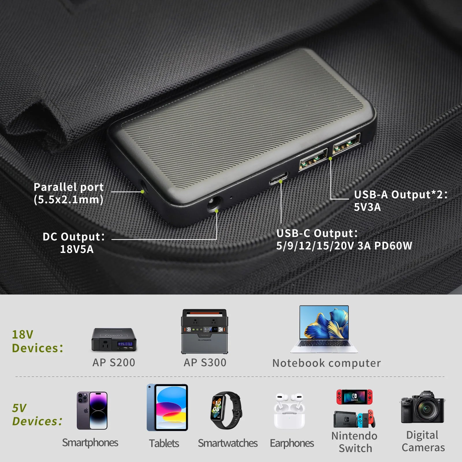 ALLPOWERS 60W solar panel provides 18V DC output (18V/5A) for portable power supply, laptop, notebook and 12V car battery. In response to the need for fast charging, the USB-C output has been increased to 60W from the previous 18W, making it ideal for USB output (5V/3A*2) as well as other USB charging devices such as 5V smartphones, ipad tablets, mobile batteries, digital cameras, and more.