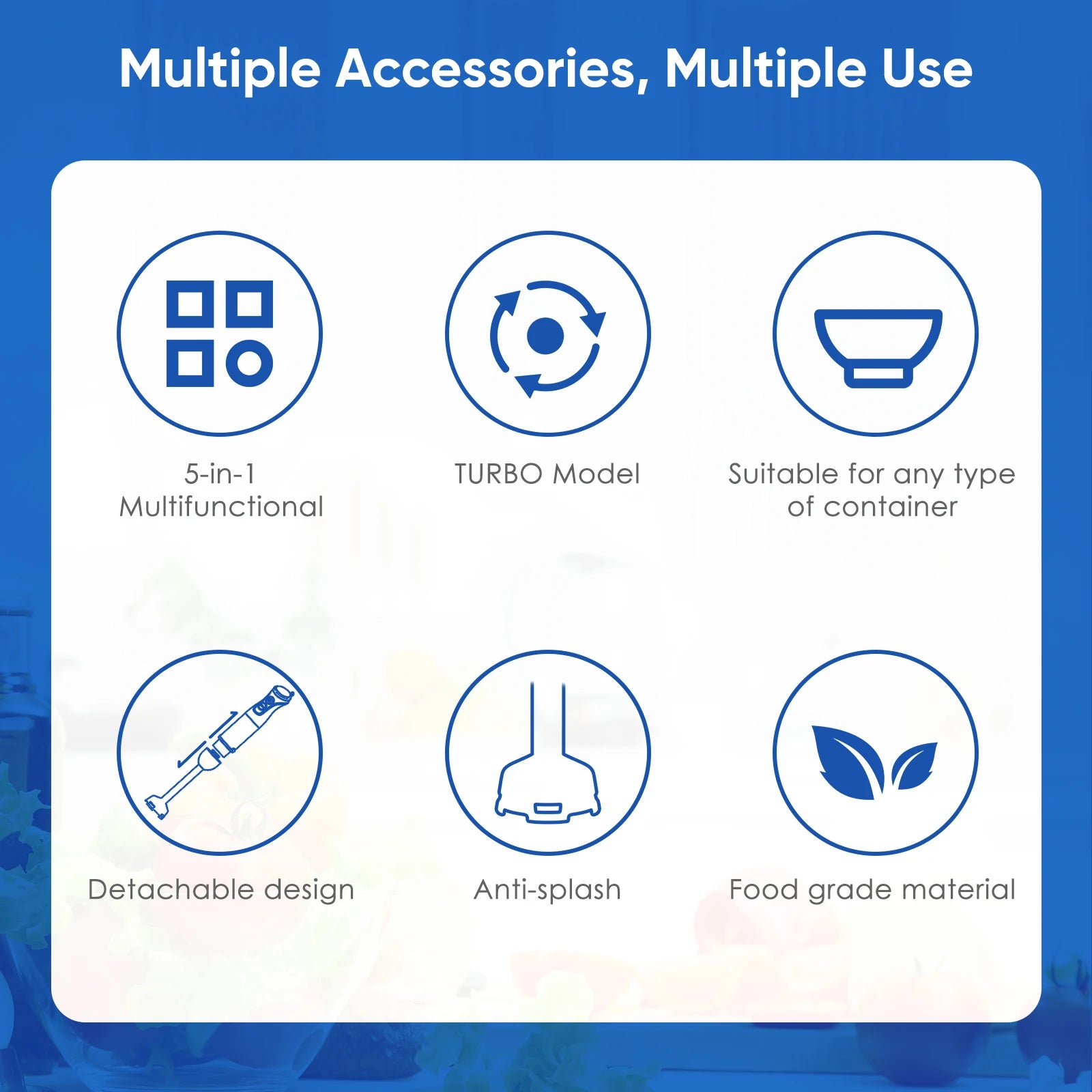 BioloMix 5 in 1 Immersion Hand Blender 1500 Watt Powerful Stainless Steel Blade Food Processor Smoothie Maker Baby Food Puree Tool
