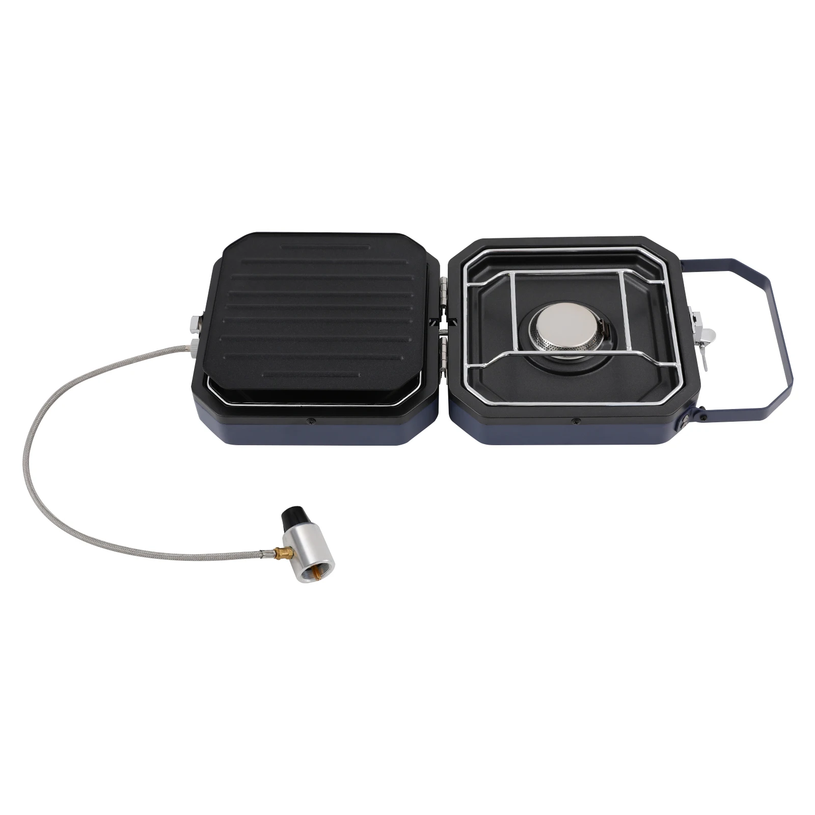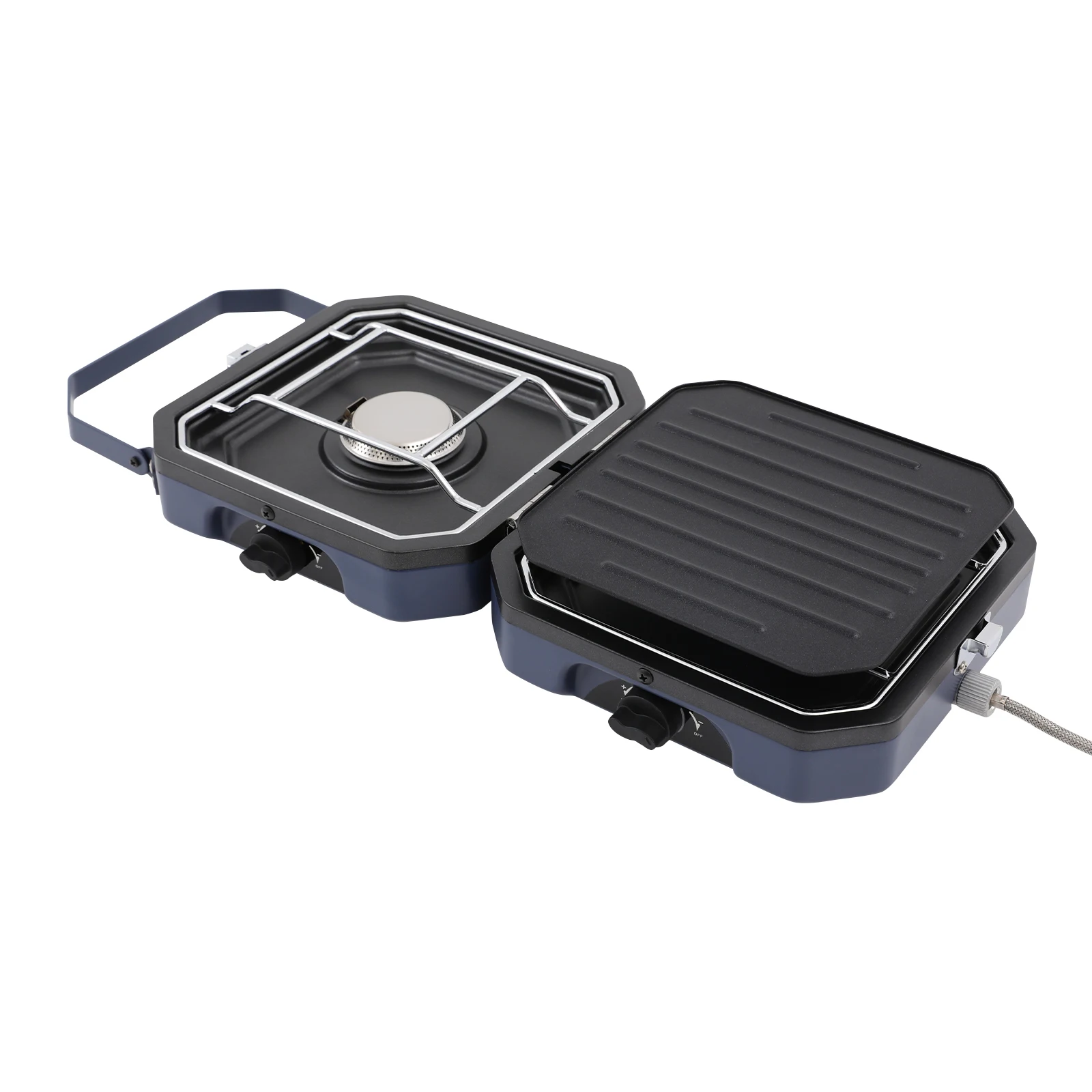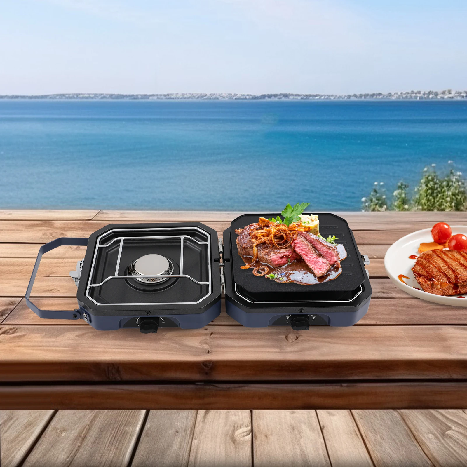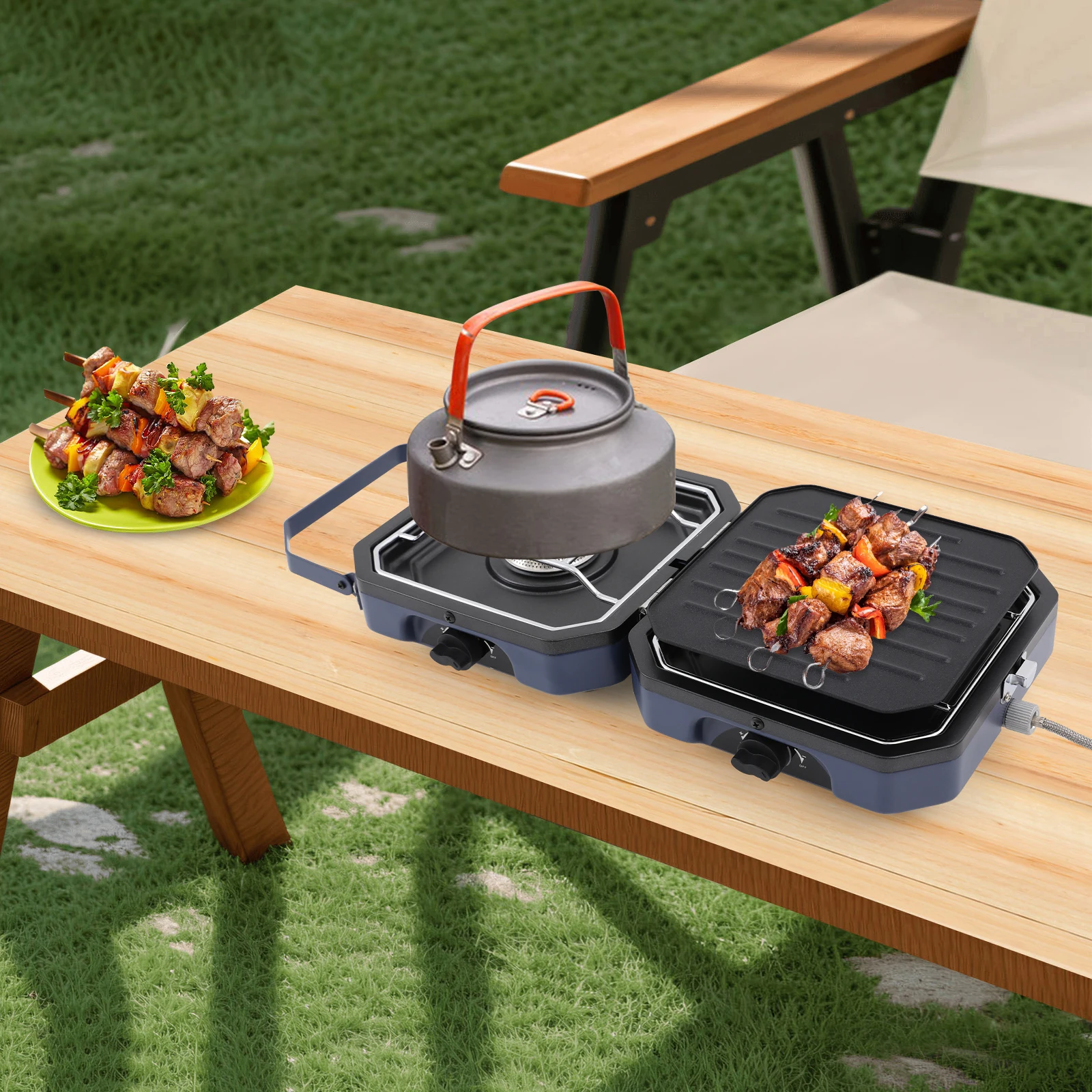 Two Burners: The product is equipped with two burners and a grill pan, so you can simultaneously barbecue and cook soup. They have independent control knobs. You can flexibly adjust it according to your own needs, making it versatile and meeting the cooking needs of different occasions, improving cooking efficiency.