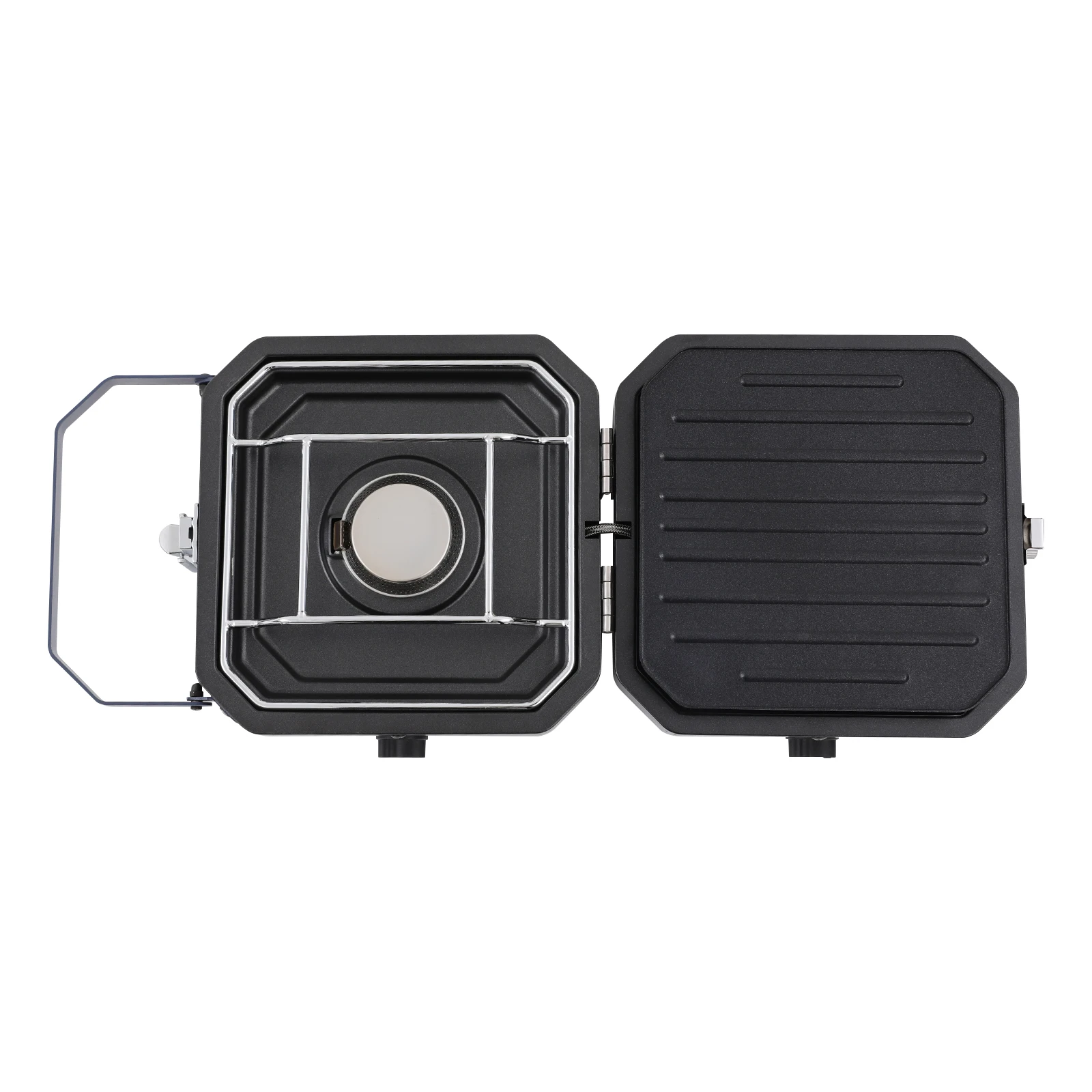 1. Open the latch and unfold the stove. Install the stove grates.
