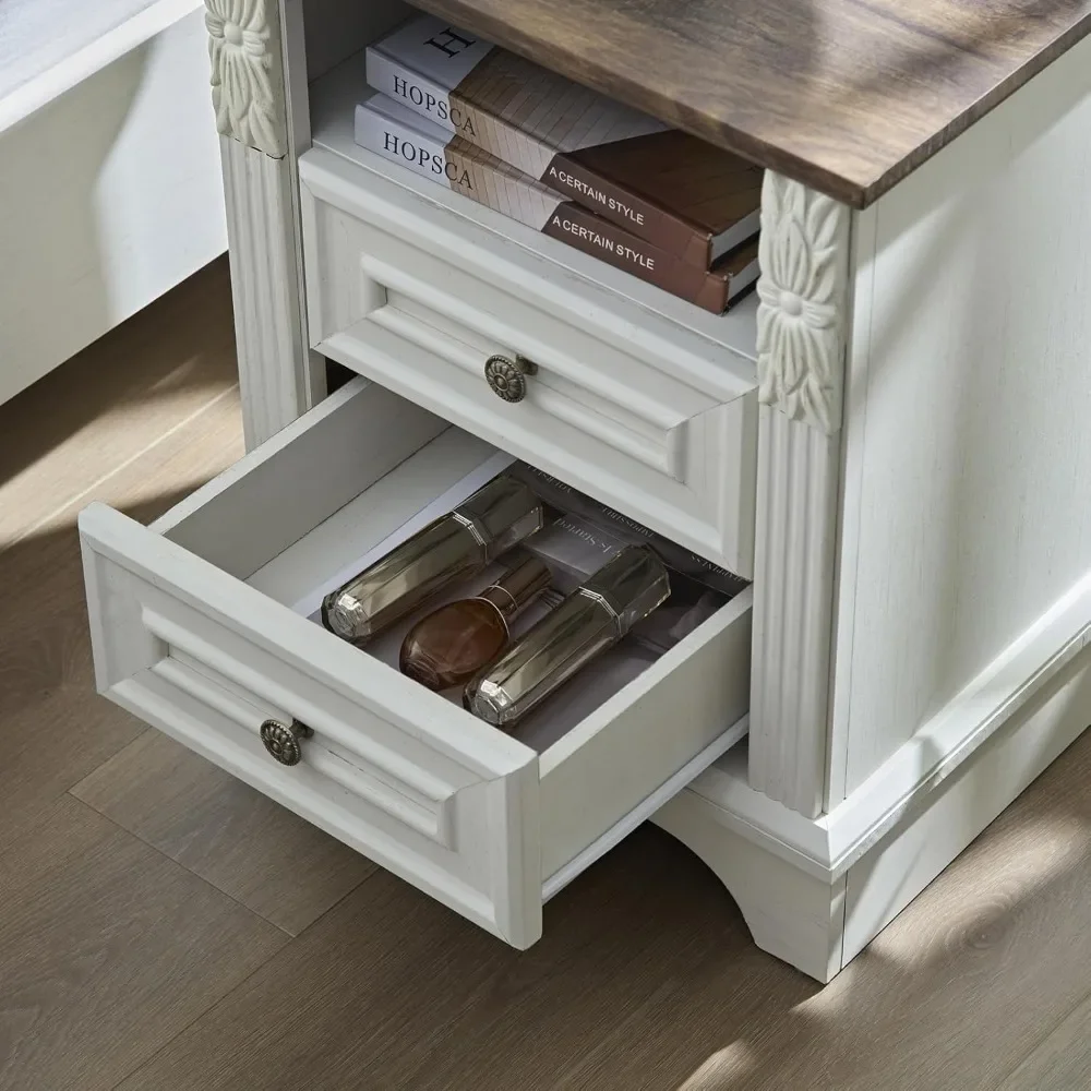 Farmhouse Nightstand with Charging Station 20" End Table 2 Drawers Carved Storage Cabinet Modern Bedroom Furniture