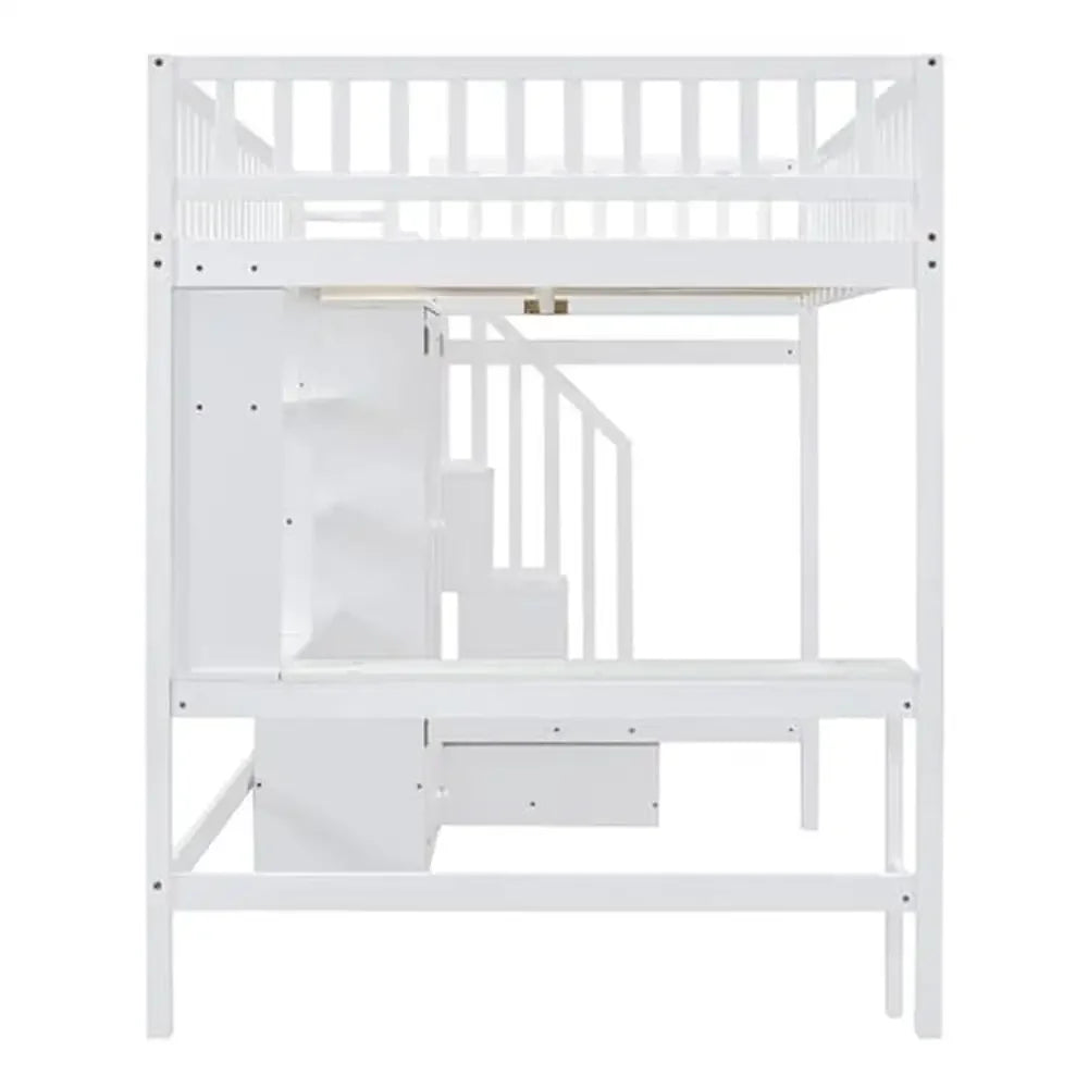 Full Size Loft Bed Combo Set with Storage Stairs Desk Bookshelf Drawers and Wardrobe Solid Wood Frame for Kids Teens and Adults in White