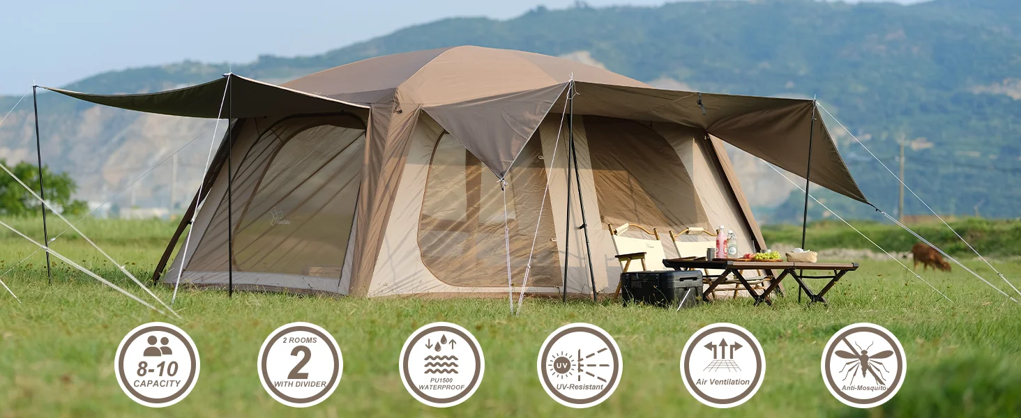 Large Family Camping Tent 8-10 Person Double Layer Waterproof 3 Door 2 Room Portable Glamping Cabin Tent for Outdoor Activities