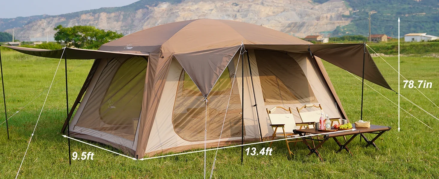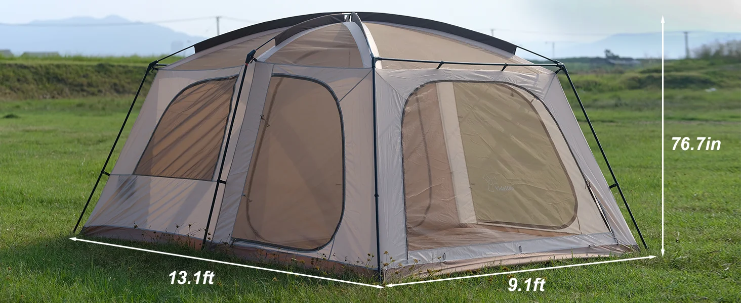 The camping tent is perfect for 8-10 person outdoor camping. With the size of 13.1ft x 9.1ft x 76.7in(H), 2 queen air mattresses (6.7ft*5ft) or 8-10 sleeping bags are well fit in the tent.