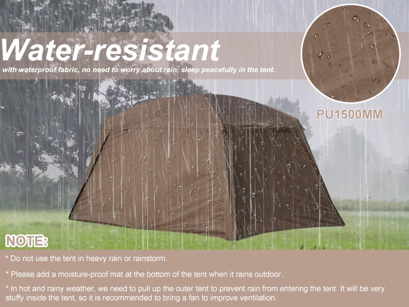 Made with anti-tear 150D polyester and 200D Oxford fabric for long lasting performance. The tent guarantees PU1500 mm water-resistant & sun protection. The tent stays completely dry in rain days.