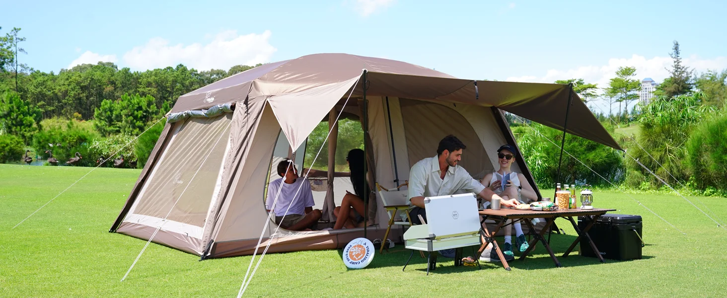 The camping tent fabric is made of 150D Oxford with fully waterproof & preminum sun protection