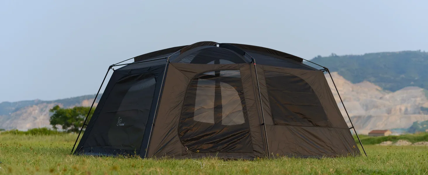 Mesh tent top and doors offer great views and ventilation, take this black camping tent back to home