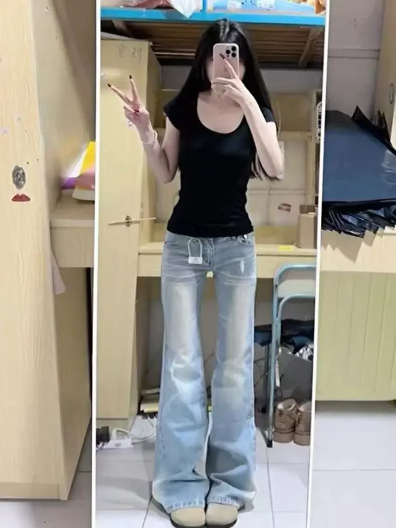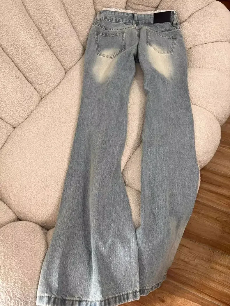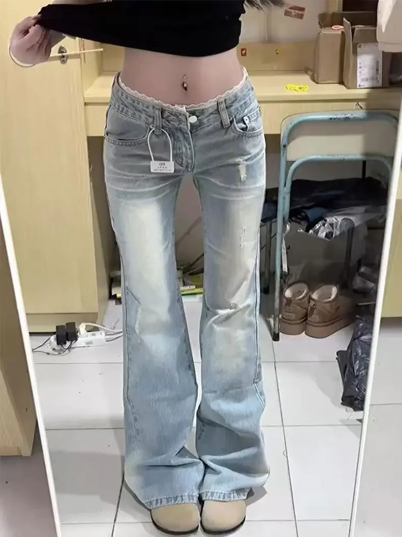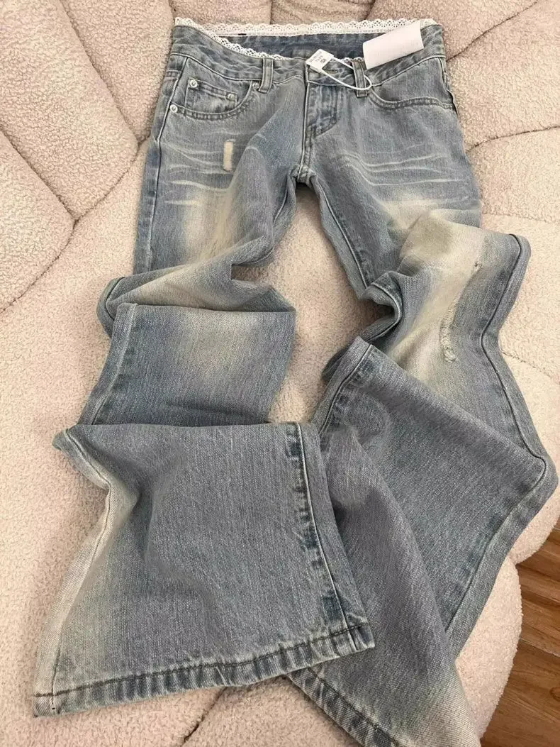 Light Lace Trim Flared Straight Leg Jeans Women's Retro Low Waist Slimming Non Fitting New 2025 Model Casual Fashion