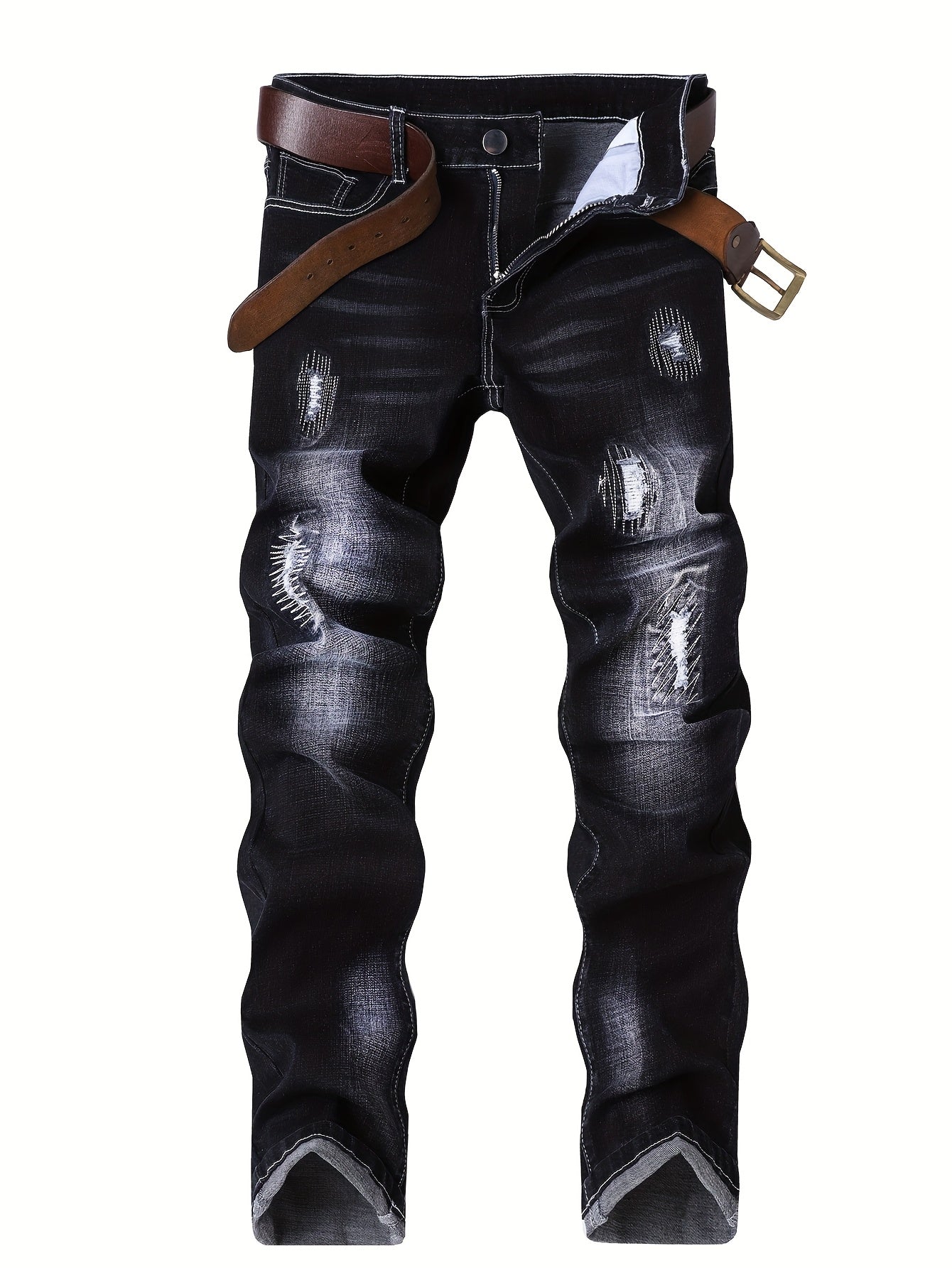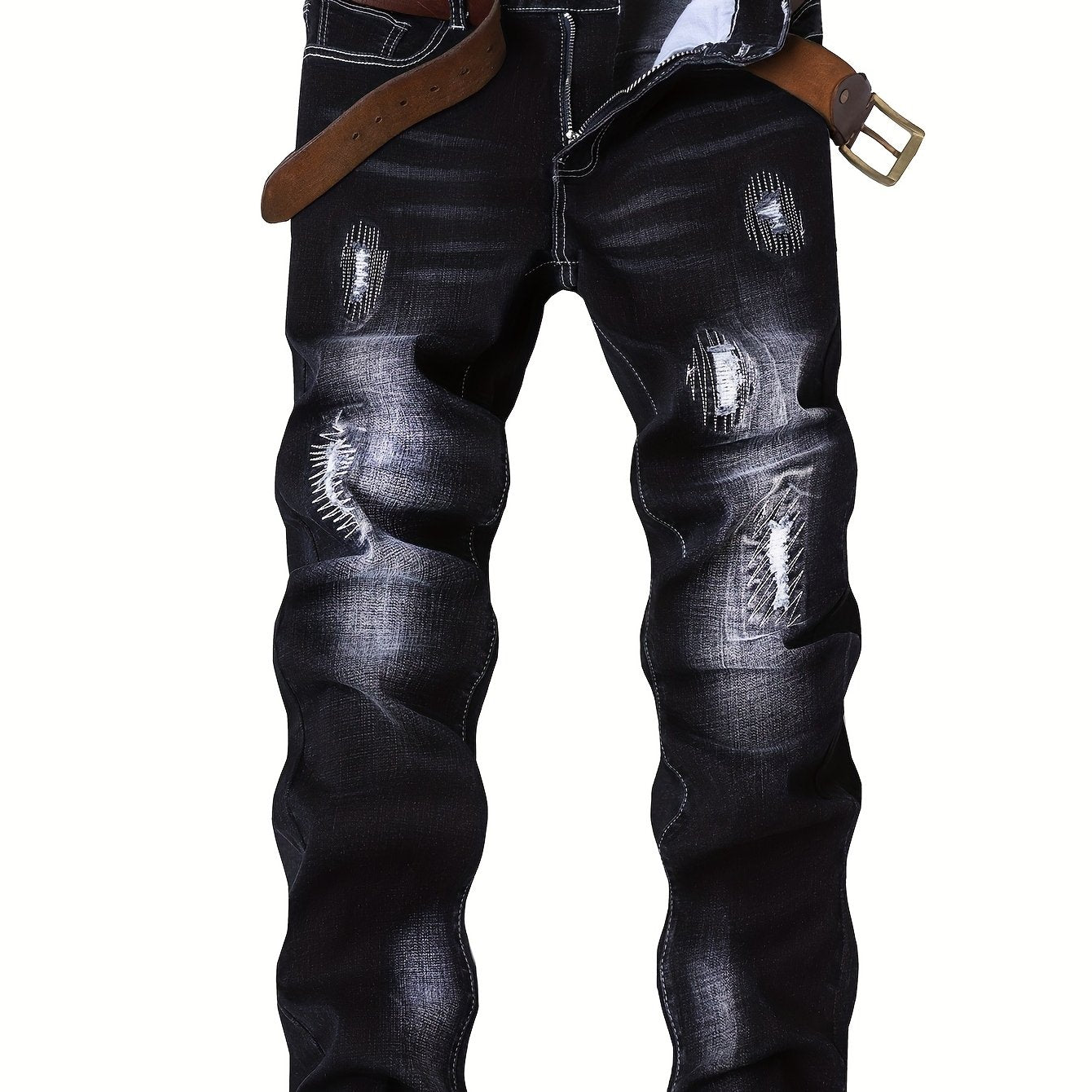 Mens Jeans with Elastic Distressed Embroidery, Slim Fit And Slimming Effect, Deep Blue Distressed Mens Clothes, Suitable for All Seasons