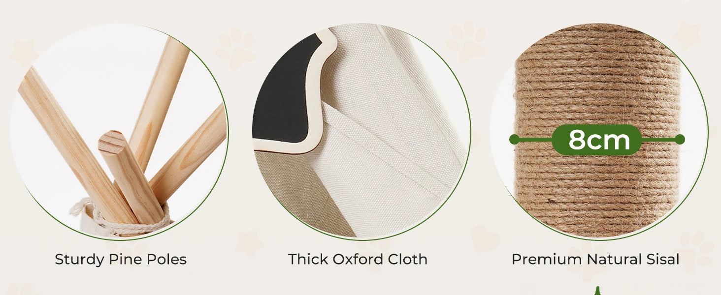 🔹 High-Quality Natural Materials – Crafted from durable cotton oxford fabric and sturdy pine poles, this breathable and stable teepee ensures long-lasting use. The scratch post is made from premium wood wrapped in high-quality natural sisal rope, providing a satisfying and safe scratching surface. The fabric cover is removable and machine washable for easy maintenance.