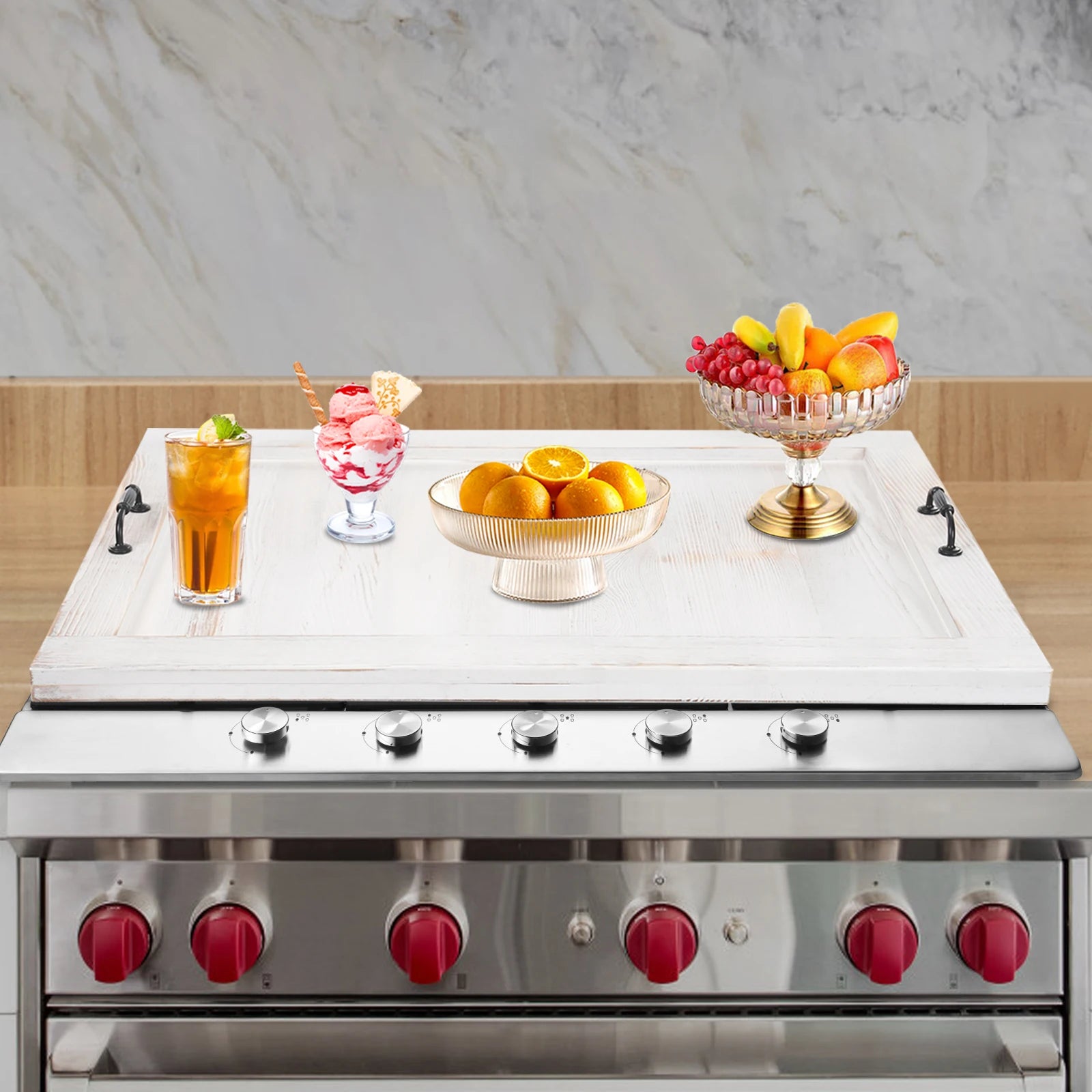 Multi-functional: It effectively protects the top of the stove and adds extra storage space to the countertop. In addition, it can also be used as a food tray to add more convenience to party catering.