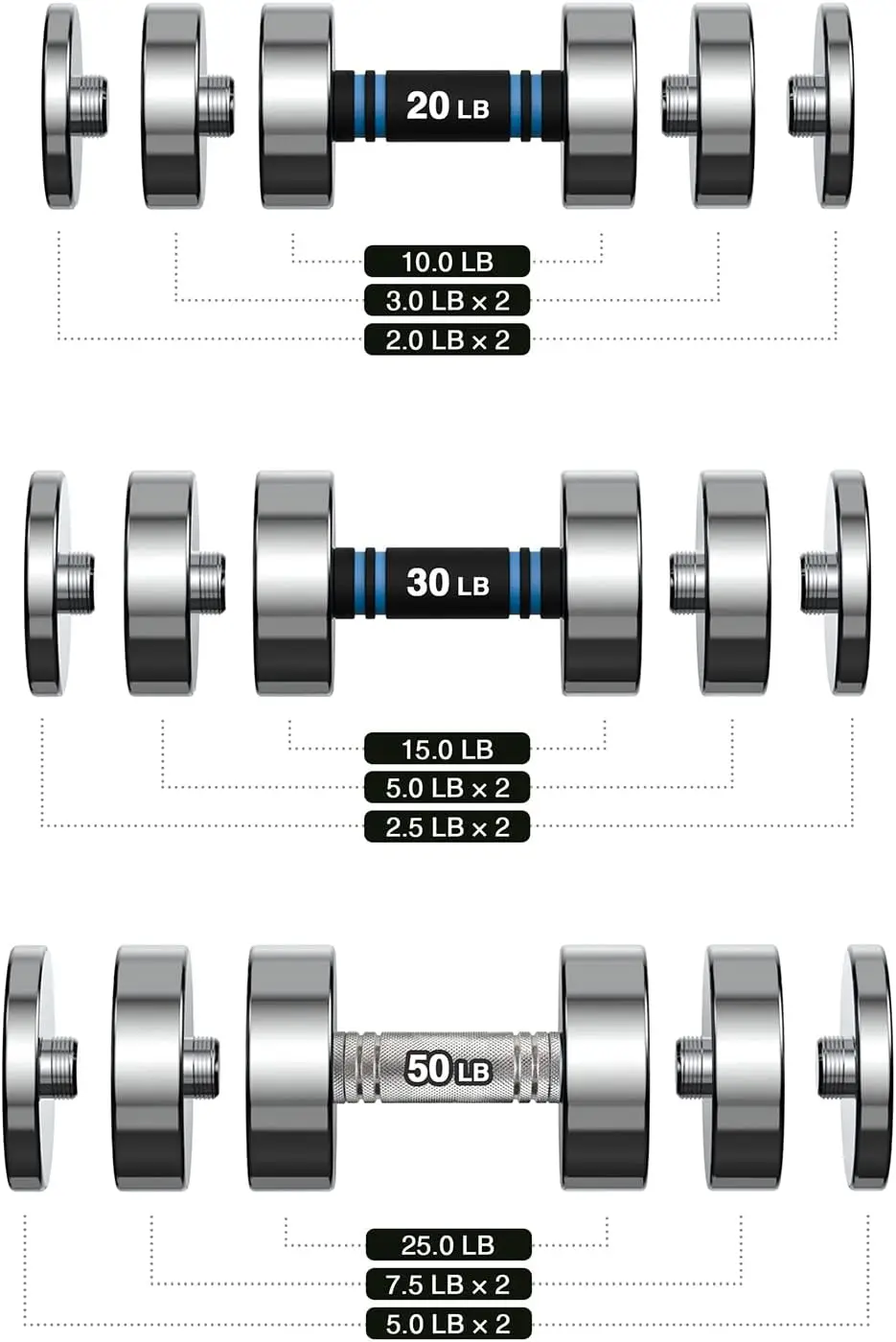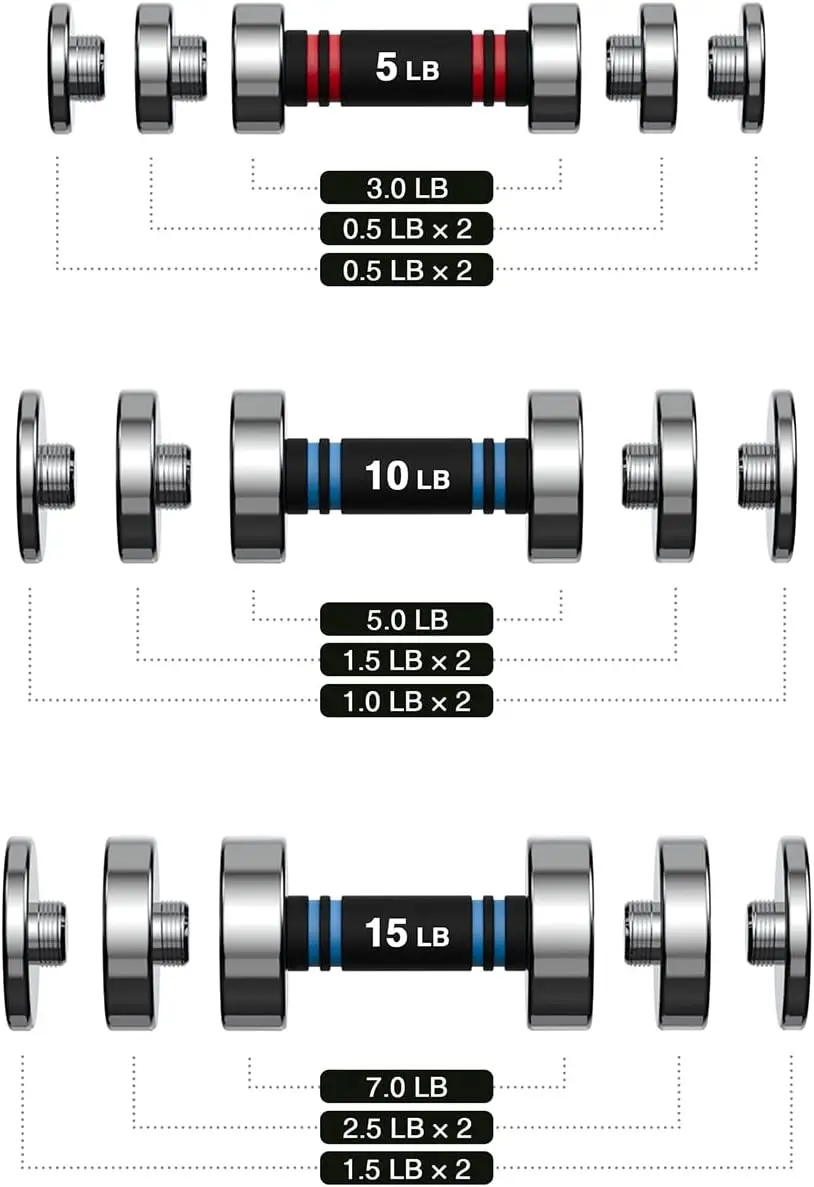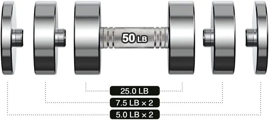 - EASY WEIGHT ADJUSTMENT: No need to buy multiple dumbbells as one dumbbell can be adjusted to multiple weights at home. With its no nut design, just unscrew the plate to quickly adjust the weight. The 10lb dumbbell can be adjusted to 5lb, 7lb, 8lb 10lb. The 15lb dumbbell can be adjusted to 7lb, 10lb, 12lb 15lb. The 20lb dumbbell can be adjusted to 10lb, 14lb, 16lb and 20lb. The 30lb dumbbell can be adjusted to 15lb, 20lb, 25lb, 30lb. The 50lb dumbbell can be adjusted to 25lb, 35lb, 40lb, 50lb.