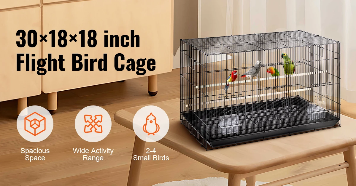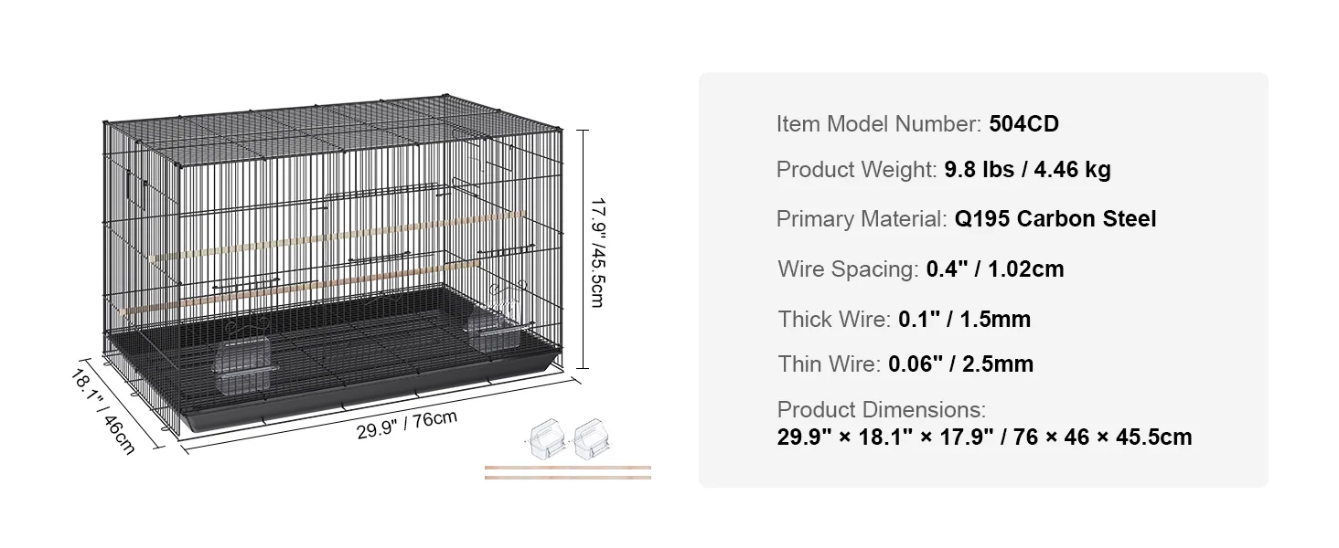 Ample Space: Measuring 29.9"L x 18.1"W x 17.9"H, with a 0.4'' grid spacing, this bird flight cage offers a roomy, comfortable living space for your pet birds to move freely, rest, and stretch their wings. Allow them to enjoy free and comfortable movement within a limited area.