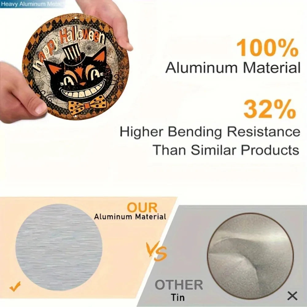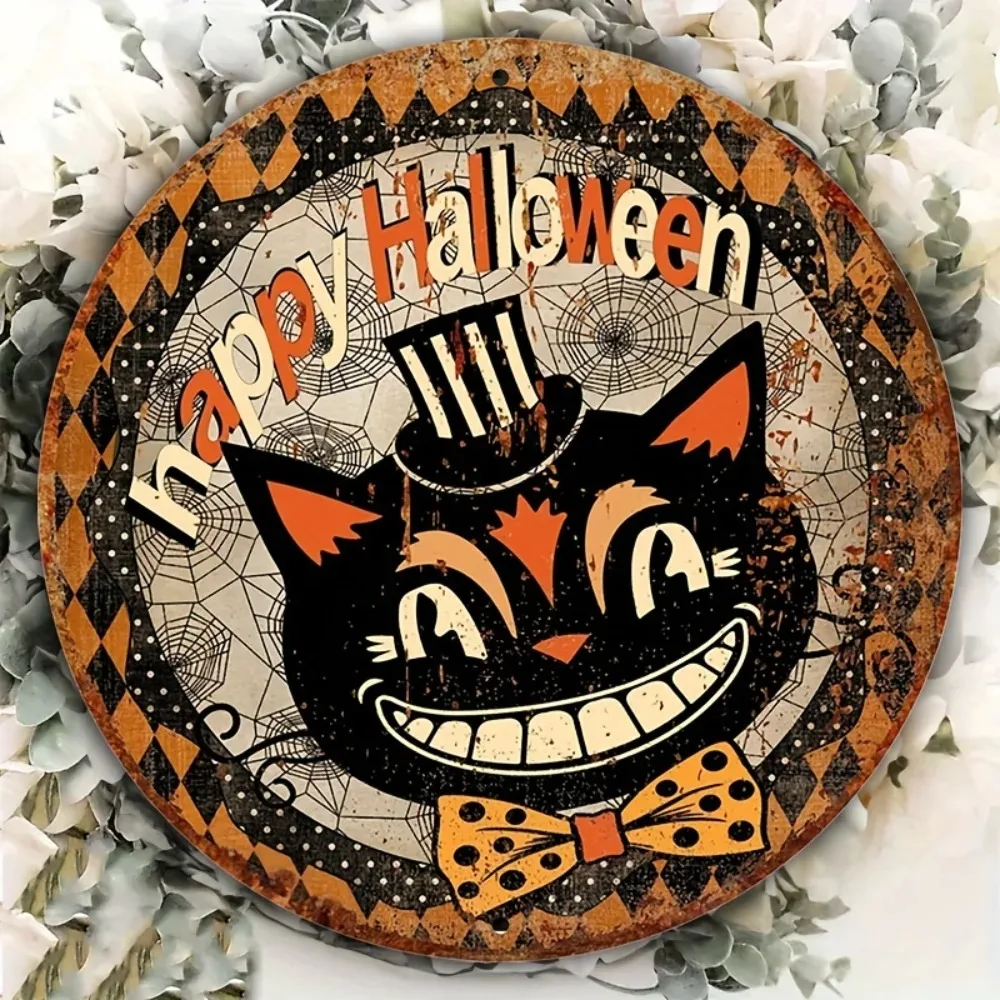Tin Painting - 8"x8" Round Aluminum Quirky Happy Halloween Sign | Black Cat Wreath Design for Home, Kitchen