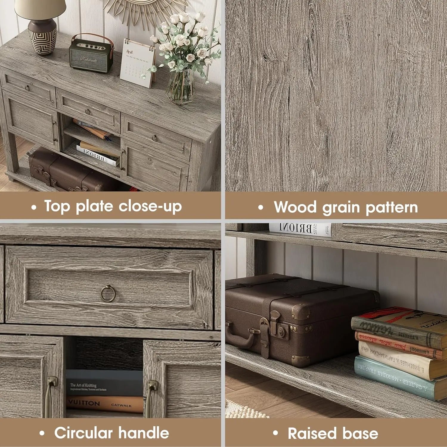 Featuring three spacious storage drawers and charming sliding barn doors, this console table not only provides ample storage but also enhances your home’s rustic charm. The rectangular shape measures 47.4 x 15.5 x 34.2 inches, making it an ideal fit for narrow spaces while still offering enough surface area for decorative items, keys, or mail.