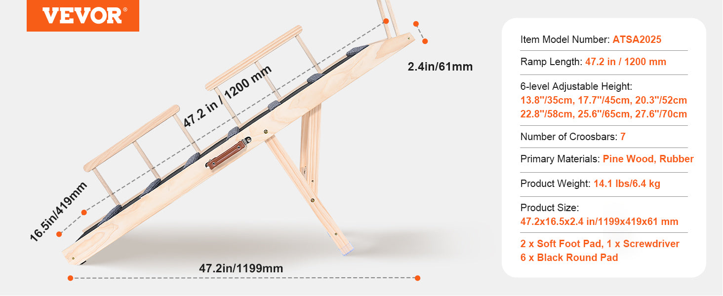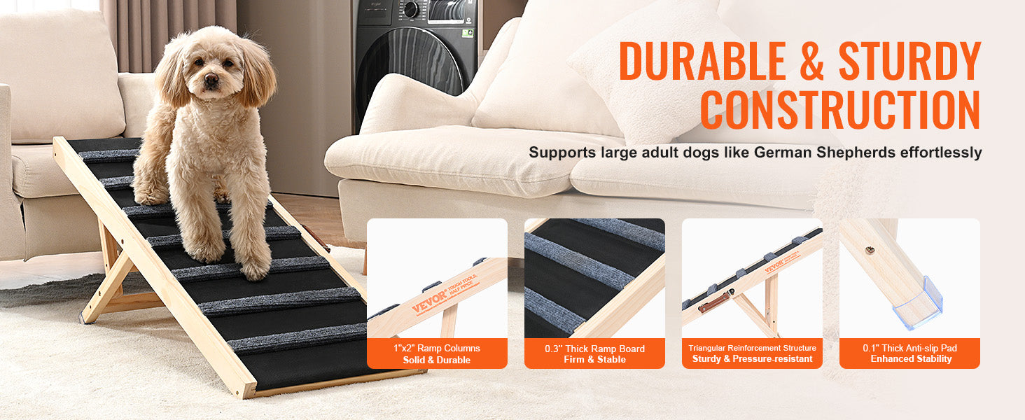 Sturdy and Durable: Crafted from premium pine wood, this solid wood adjustable dog ramp is exceptionally stable and can support pets weighing up to 100 lbs. The addition of soft rubber footpads at the bottom ensures stability during your pet's ascent.