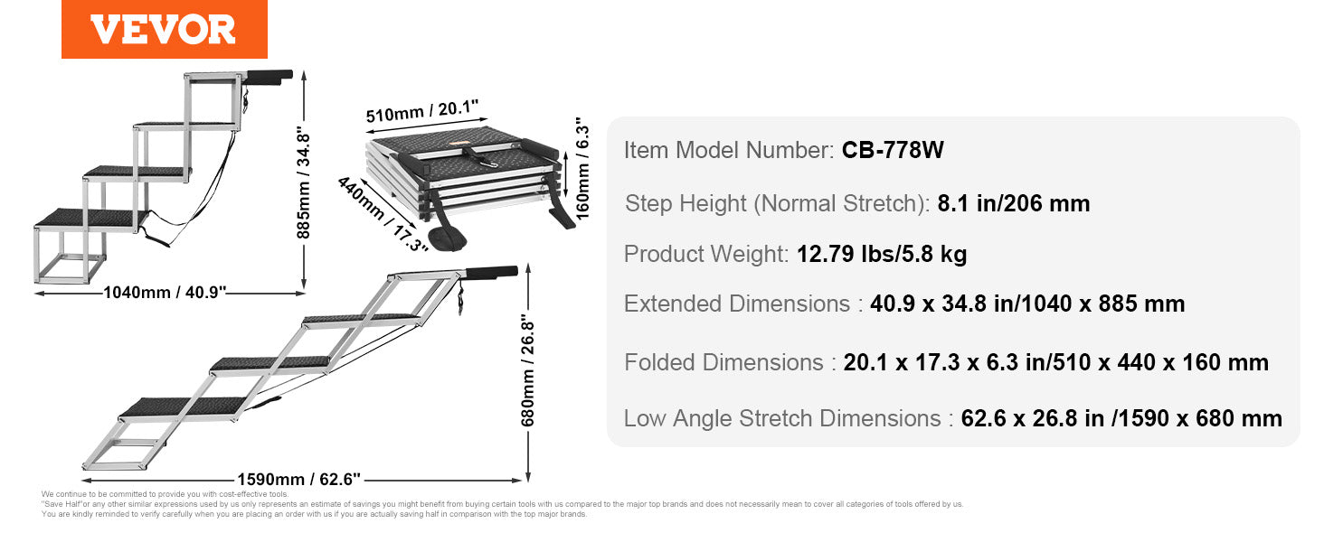 Product Dimensions: At a normal stretch angle, the portable dog steps' length and the height. At a lower angle, the length and the height, making it easy for your pet to access car trunks or side doors.