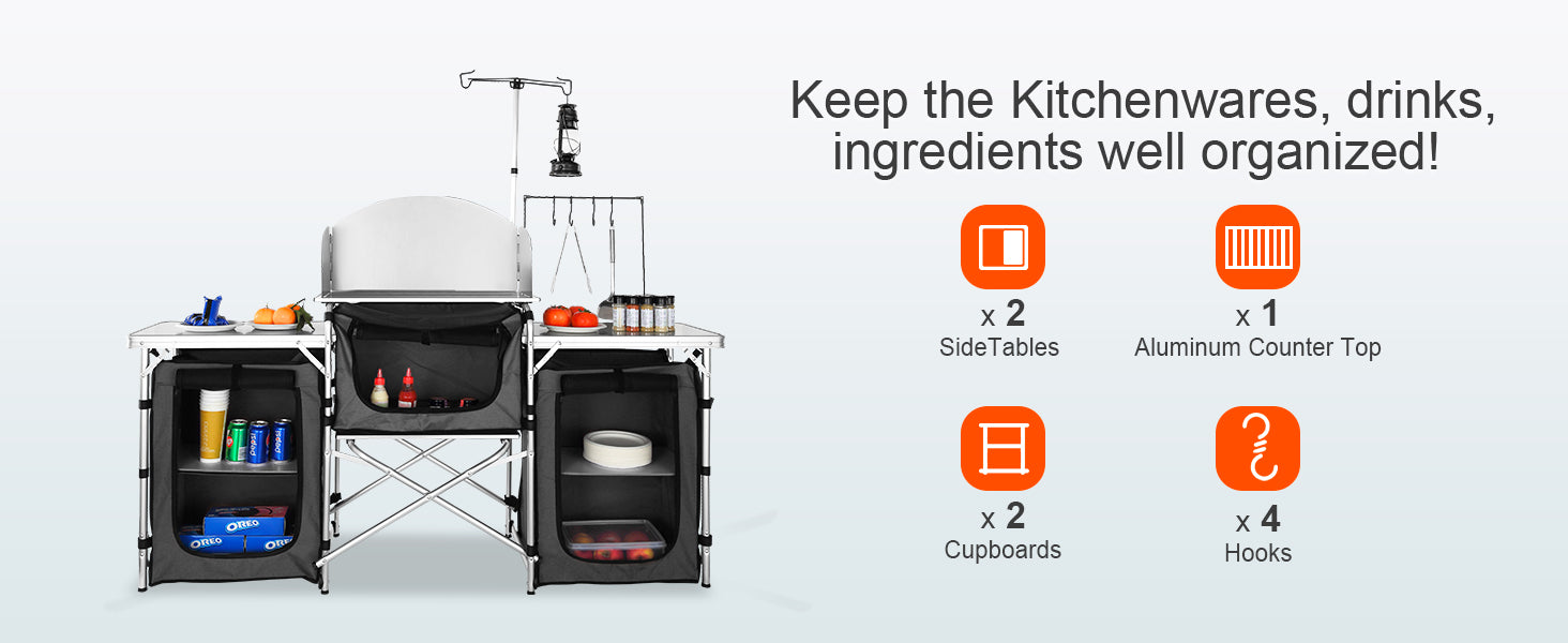 Great Space Management: Our camping kitchen table is designed to take your kitchen outside! You can organize your food, stoves, grills, and cookware in an orderly manner on the tabletop, zippered storage compartments, side table, and storage shelf. You can hang the spatula, ladle, tongs, etc on the hooks.