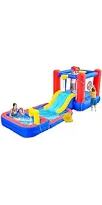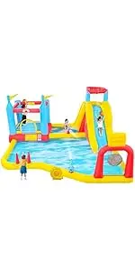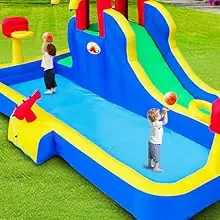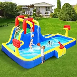 Water cannon, slide, deep pool, double basketball rings for children with more ways to play than a traditional inflatable water slide park.
