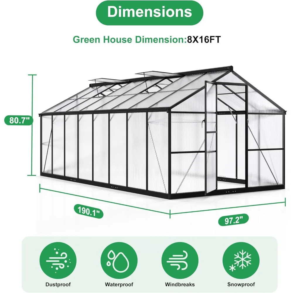 - Rugged dimensions of 190.1 L x 97.2 W x 80.7 H inches provide ample growing space; bury footings in soil or concrete for wind- and snow-resistance.