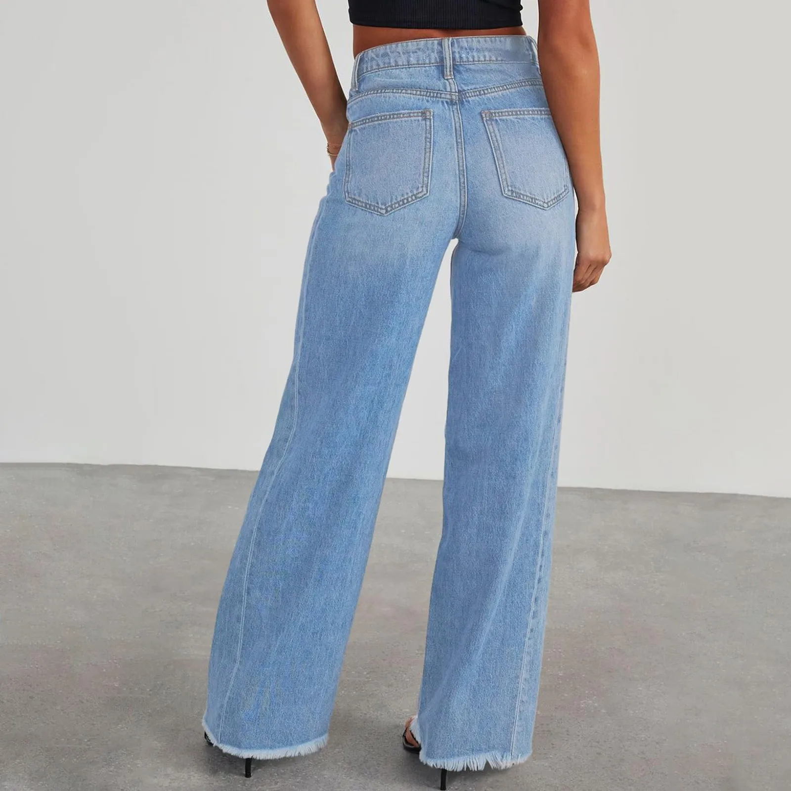 Women High Waist Casual Loose Wide Leg Slim Denim Pants Elegant Splice Pockets Straight Leg Floor Length Jeans