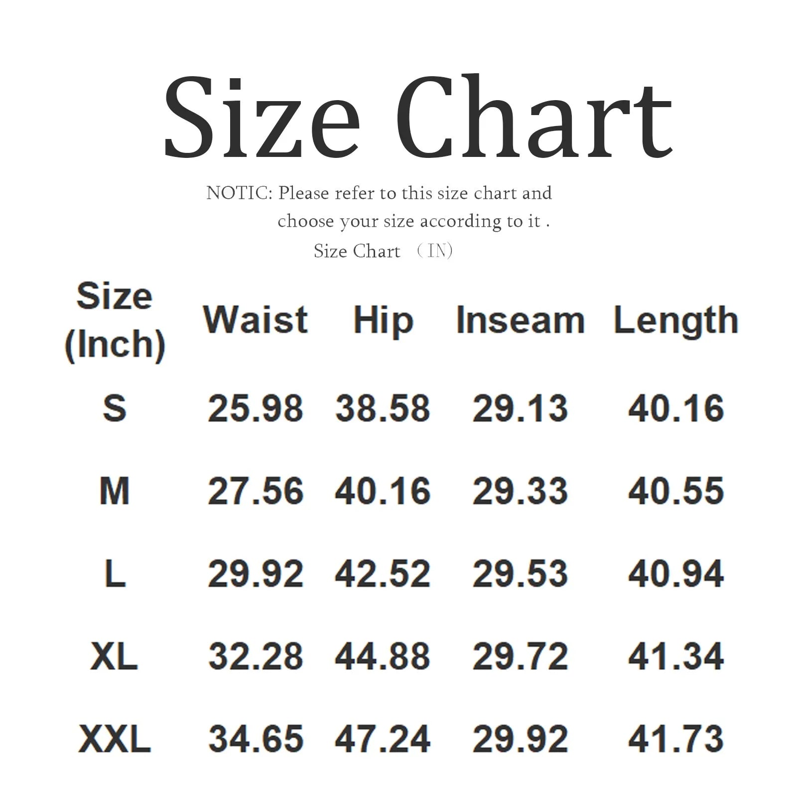 | Size | Waist | Hip | Inseam | Length |